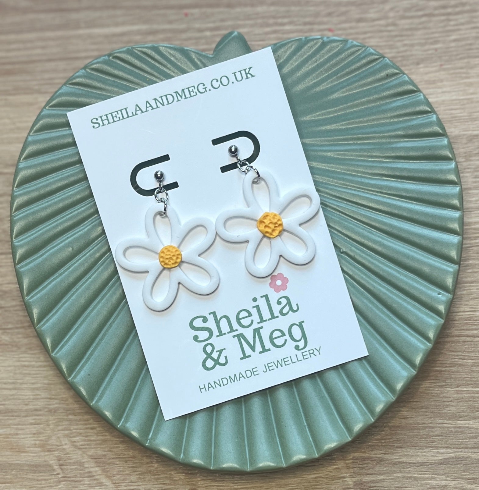 The very cute Daisy Dangles! White with yellow centre and silver coloured, hypoallergenic, stainless steel ball studs. Approx 4cm in length.